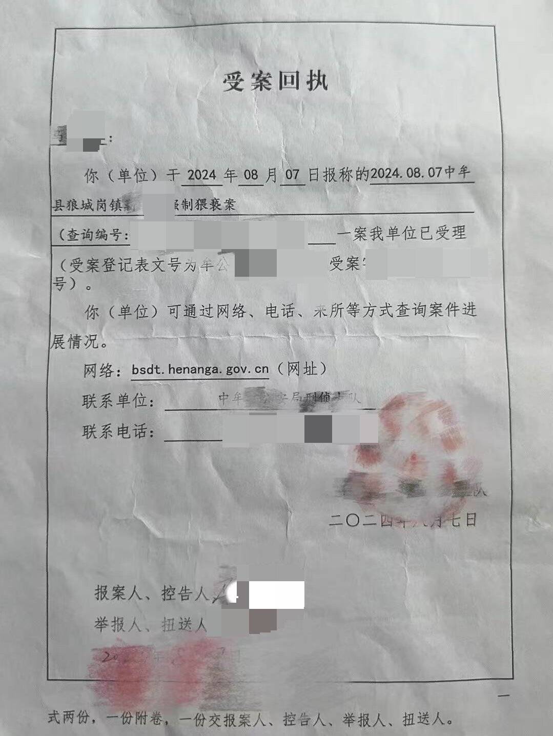 马先生提供了一份受案回执,显示马某某,你于2024年8月7日报称的中牟县狼城岗镇靳某强制猥亵案一案,我单位已受理。联系单位为中牟县公安局刑侦大队。