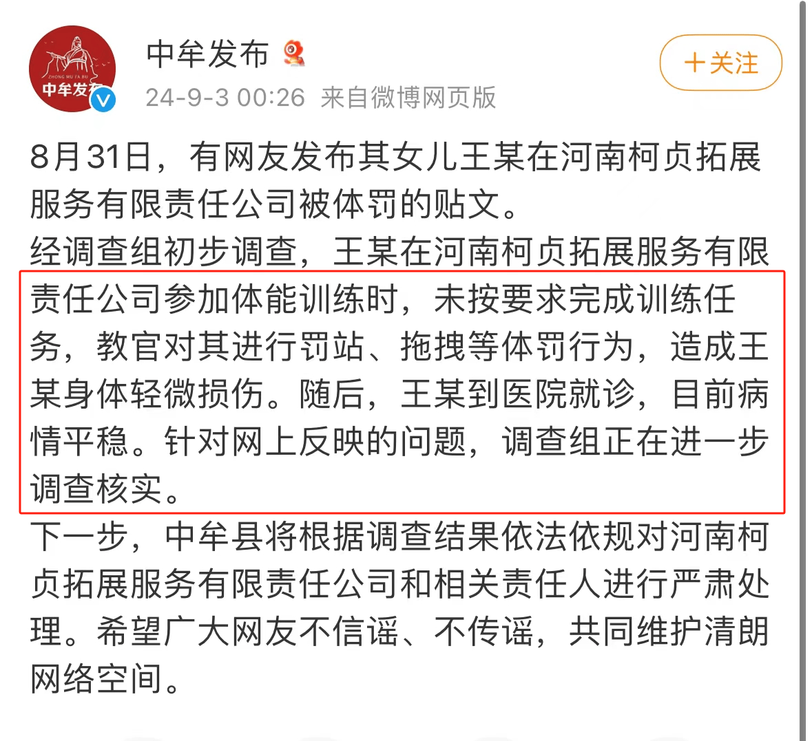 9月3日0时26分,中共中牟县委宣传部官方微博“中牟发布”通报称:8月31日,有网友发布其女儿王某在河南柯贞拓展服务有限责任公司被体罚的贴文。经调查组初步调查,王某在河南柯贞拓展服务有限责任公司参加体能训练时,未按要求完成训练任务,教官对其进行罚站、拖拽等体罚行为,造成王某身体轻微损伤。随后,王某到医院就诊,目前病情平稳。针对网上反映的问题,调查组正在进一步调查核实。下一步,中牟县将根据调查结果依法依规对河南柯贞拓展服务有限责任公司和相关责任人进行严肃处理。