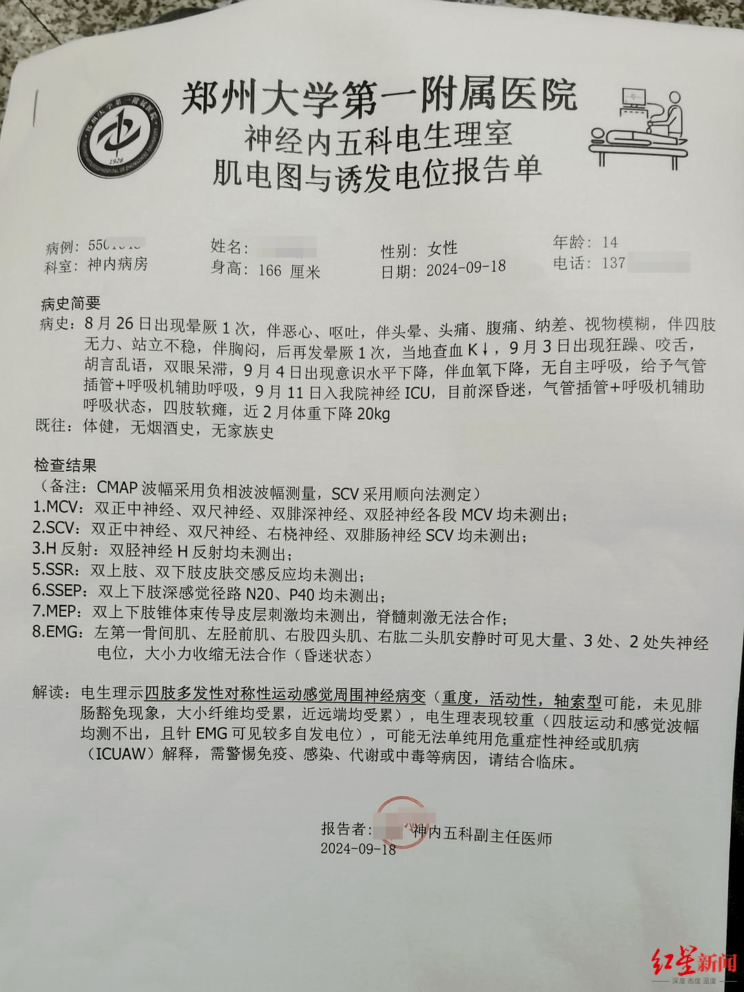 25日,小王的父亲向记者表示,目前其女儿还没有恢复意识,也没脱离危险期,需要继续住在重症监护室内。小王父亲提供的一份检查报告显示,9月4日,小王出现意识水平下降,伴血氧下降,无自主呼吸;9月11日,小王进入郑州大学第一附属医院神经ICU;至报告日(9月18日)持续深度昏迷,四肢瘫软,两个月内体重下降20公斤。