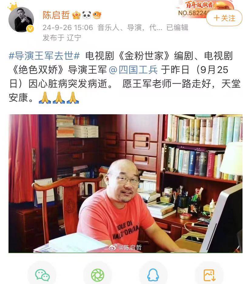 导演陈启哲也发文悼念王军,透露去世原因,愿王军老师一路走好,天堂安康!