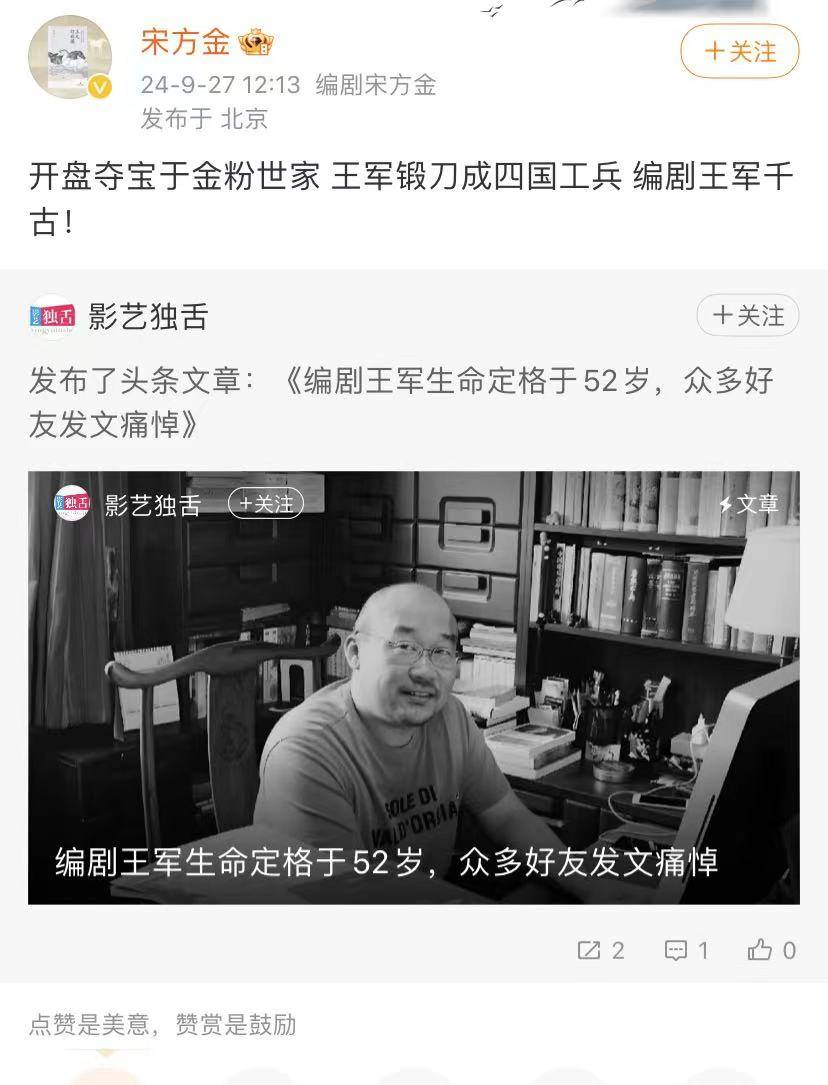 《手机》《决胜》的编剧宋方金也发文悼念,他也是毕业于中戏。同为编剧,也是中戏人,对于王军的去世,都表示非常的悲痛。