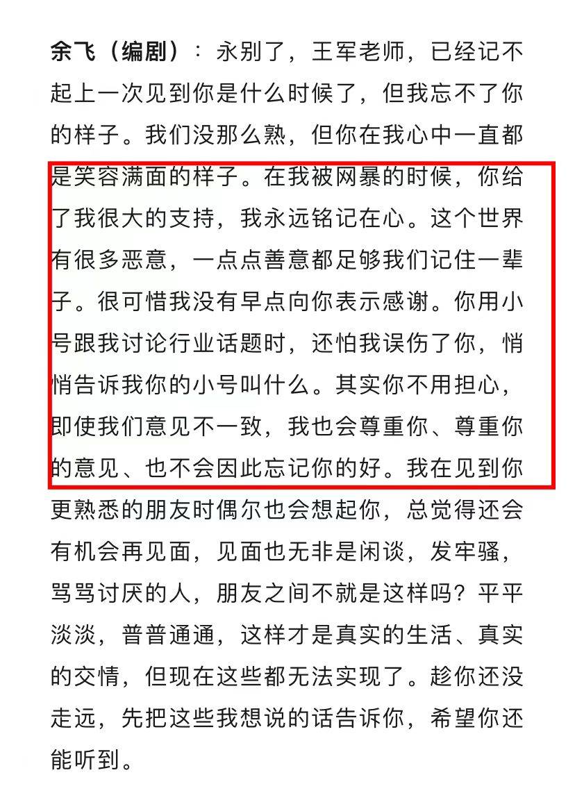 余飞表示虽然和王军不是很熟,但一见如故,在他被网暴的时候给予很大的支持,永远铭记在心。很可惜没有早点向王军表示感谢,虽然他们观点可能不一致,但他会尊重王军的意见,也不会忘记他的好。