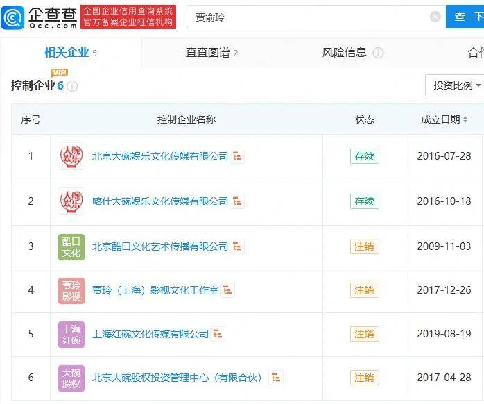 目前,贾玲共有6家控制企业,其中仅北京大碗娱乐文化传媒有限公司、喀什大碗娱乐文化传媒有限公司为存续状态。