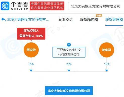 企查查APP显示,大碗娱乐关联公司北京大碗娱乐文化传媒有限公司成立于2016年7月,注册资本为100万元人民币,贾玲(本名:贾俞玲)持股65%,为大股东、实际控制人,贾玲父亲贾文田担任法定代表人、董事长。