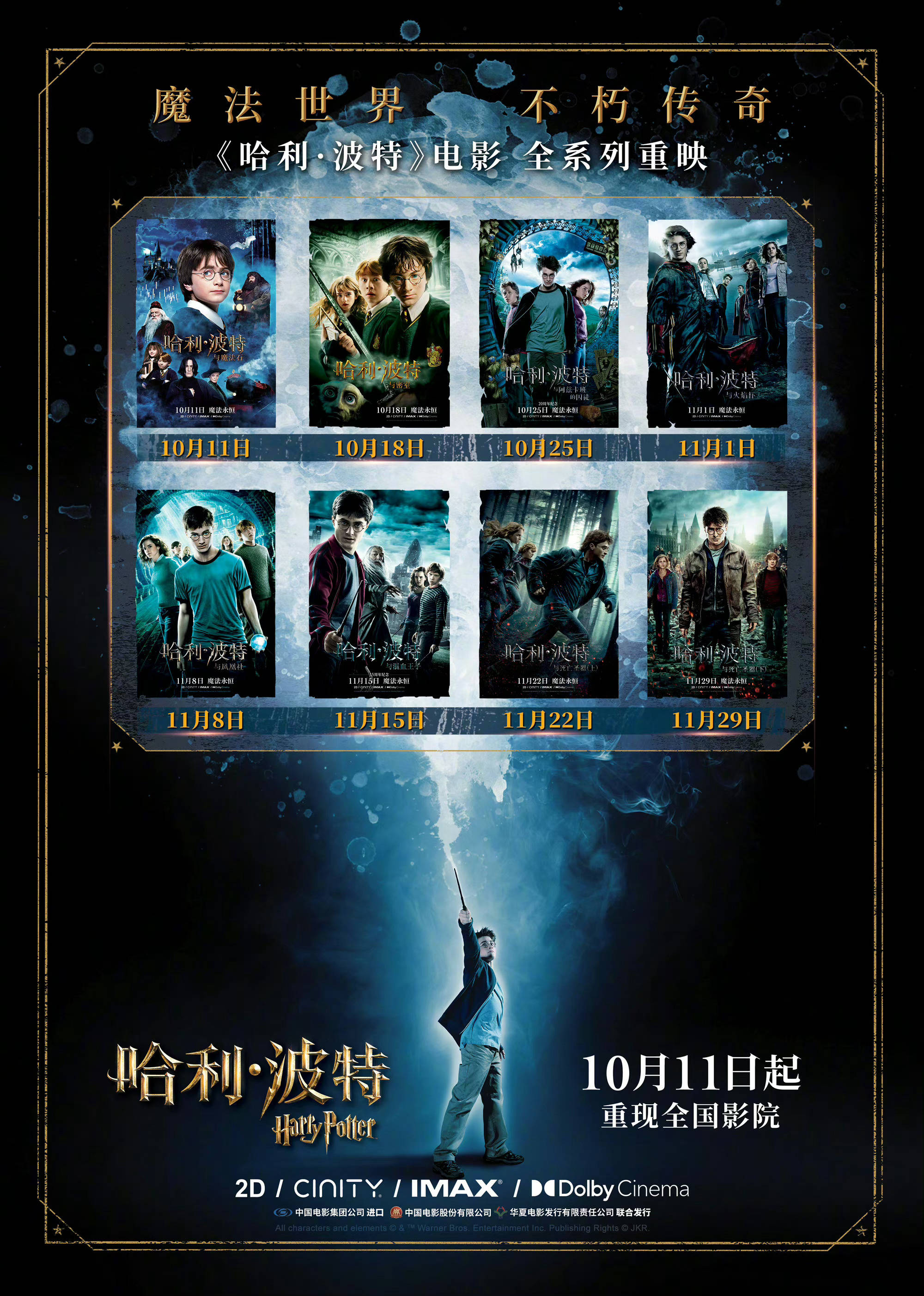 搜狐娱乐讯 《哈利·波特》正式发布全系列重映中文海报,霍格沃茨的回忆齐齐袭来。影片系列将于10月11日起,每周一部持续上映。“该来的总归会来,一旦它来了,你就必须勇敢地去面对”。