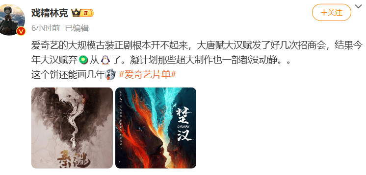 而且大规模的古装正剧也根本开不起来,《大唐赋》和《大汉赋》都开了几次招商会了都没动静。