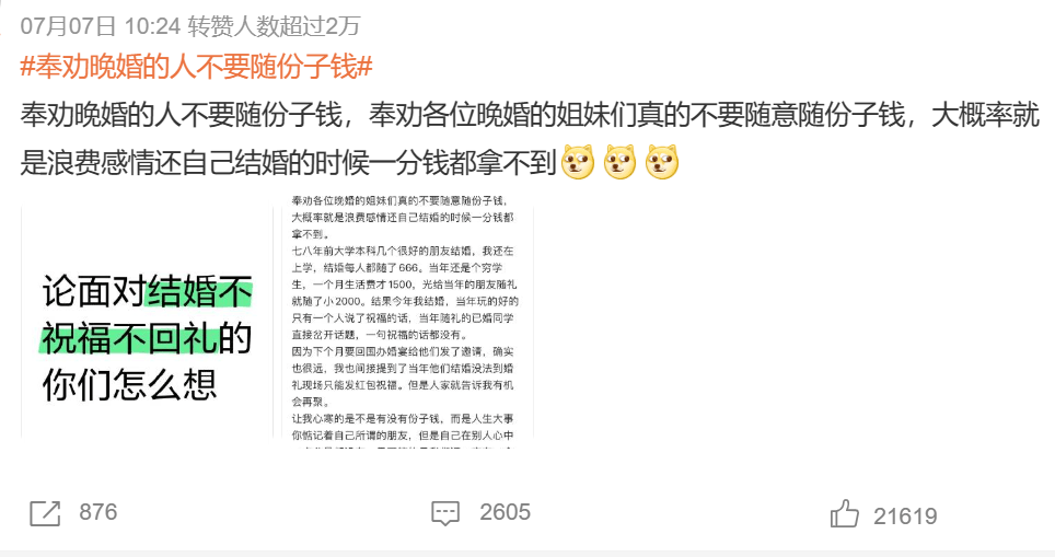 不久之前,「奉劝晚婚的人不要随便随份子钱」话题还登上热搜。