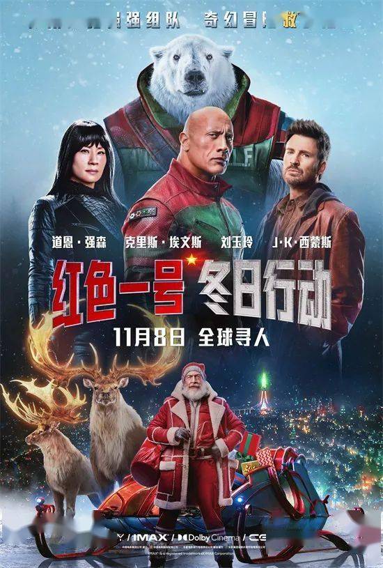 好莱坞动作奇幻喜剧电影《红色一号:冬日行动》宣布内地定档11月8日,提前北美一周上映。巨石强森、刘玉玲“盛情”邀请“美队”克里斯·埃文斯加入寻找圣诞老人的救援小队,一场前所未见的极限冒险就此开启。影片由杰克·卡斯丹(《勇敢者游戏》系列)导演,道恩·强森、克里斯·埃文斯、刘玉玲、J·K·西蒙斯等出演。