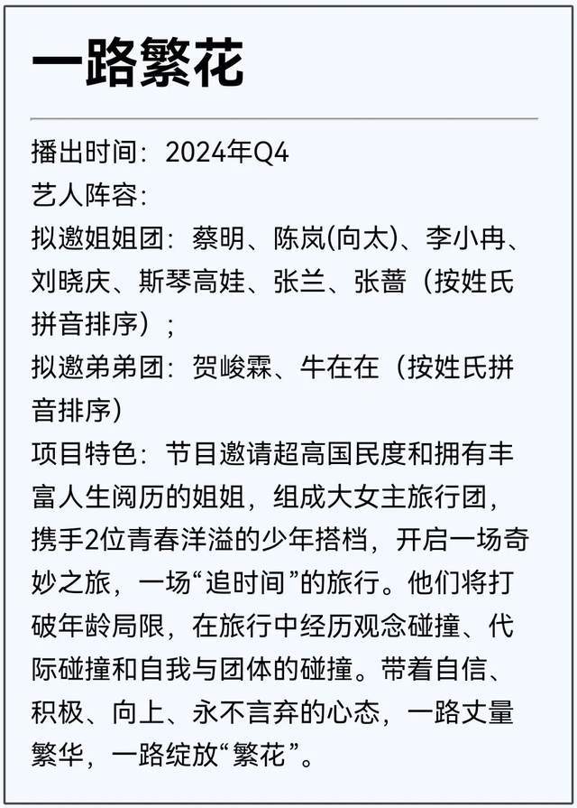 还有网友已经开始可怜弟弟团了,节目主打的是组成大女主旅行团,只带两个弟弟。但拟邀名单上的这些姐姐们年纪其实都不小了,光是搬行李就是个问题,隔壁花少节目组在大部分姐姐是年轻人的情况下都很累,到了《一路繁花》这个跨龄剧组,岂不是会更累?