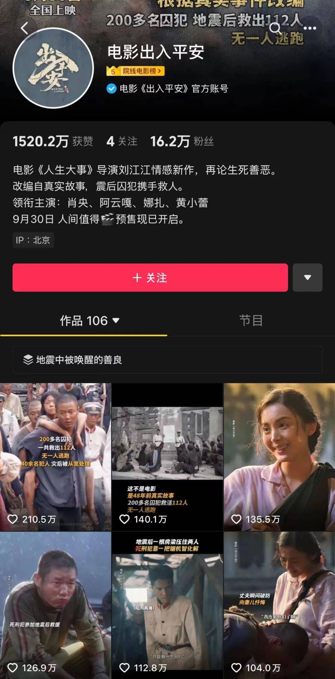作为《人生大事》导演新作,《出入平安》在前期宣发阶段则更突出“《人生大事》导演新作”以及“真实事件改编”两大要点。真实事件打底赋予了这部影片在抖音平台上更好的传播效果,目前已经有5则百万点赞物料和1则二百万点赞物料,是今年国庆档中短视频热度最突出的一部。