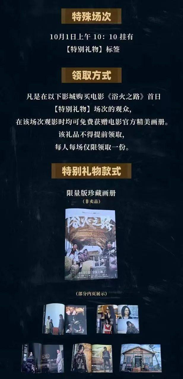 《浴火之路》则把特典场玩法带到了国庆档,该片将在10月1日上午 10:10推出赠送非卖品限量版珍藏画册的特殊场次,如此针对性施策,立刻收获了赵丽颖粉丝群体的广泛欢迎。而体量更小的《熊猫计划》也联合元气森林也加入了这一阵营,将在10月1日当天推出50家影院的“笑出元气”主题活动,届时观众在特殊场观影可以得到一瓶新口味气泡水。