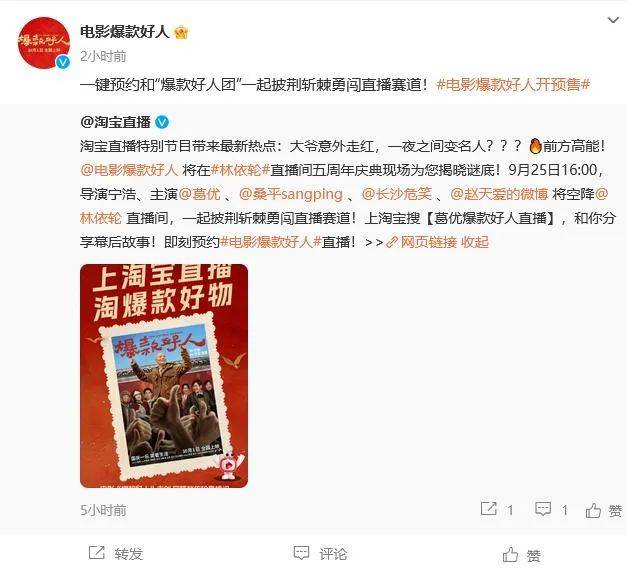 不过这部影片也找到了自己的应对之道。今天下午《爆款好人》官宣了将在明日携众主创亮相林依轮直播间的消息。平心而论,直播卖票早已经算不上风口,甚至现在尝试这种宣传方式的影片也所剩无几,但在国庆档这种竞争异常激烈的场景,在《爆款好人》的“错峰”宣传,倒不失为一个恰当的方向。