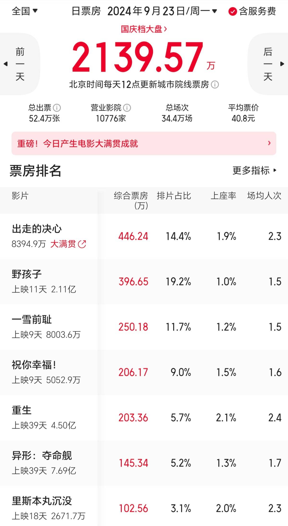 这部片在中秋档一开始热度不高,上座率偏低,随着口碑的发酵上座率逐日领先,远超《野孩子》《一雪前耻》《祝你幸福!》等同档期电影,猫眼专业版预测其最终总票房可能到1.2亿元。