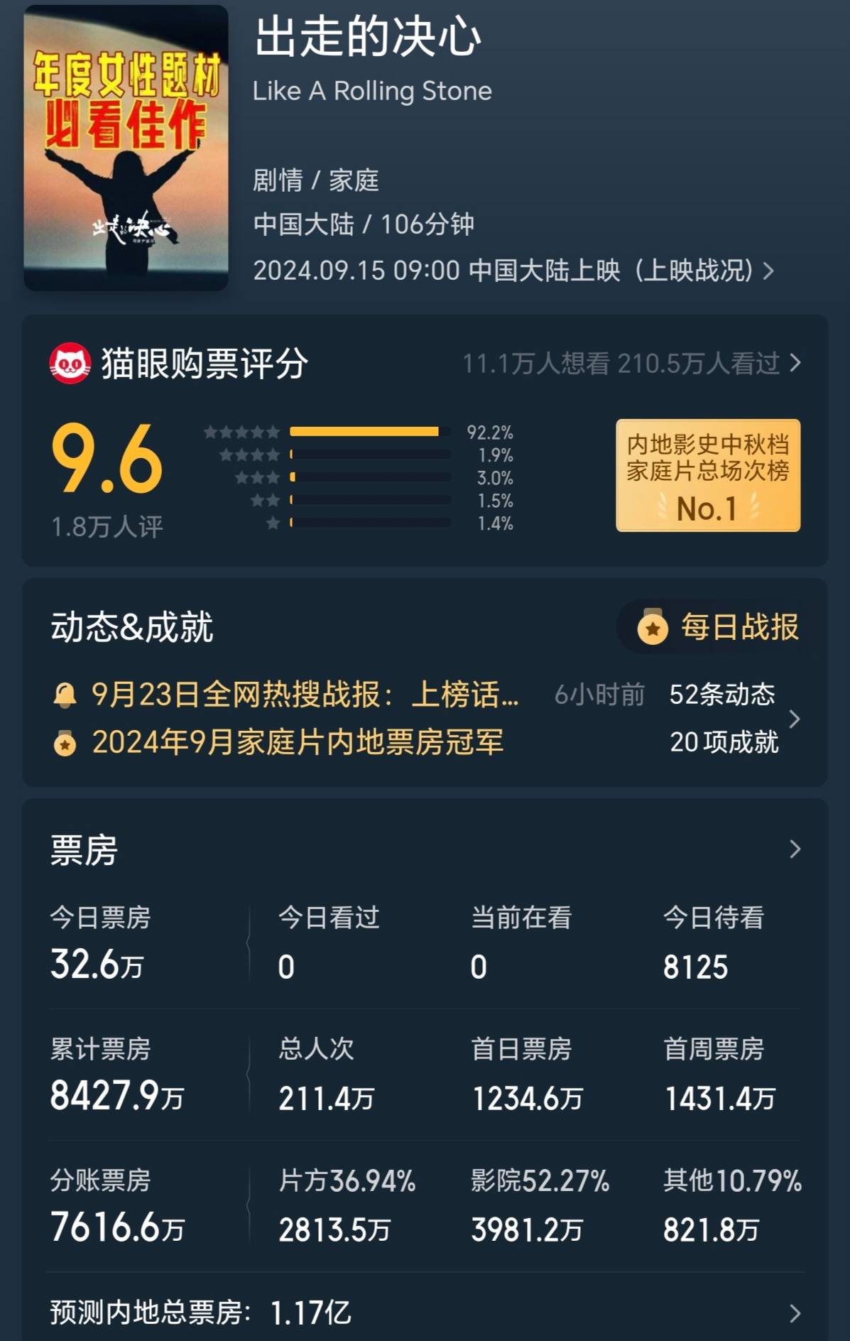 搜狐娱乐讯 (哈麦/文)上映第九天,咏梅主演的女性题材电影《出走的决心》单日票房超过了王俊凯主演的《野孩子》,逆袭夺冠。
