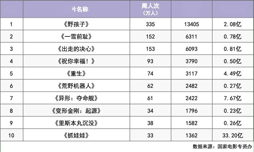 《野孩子》蝉联周票房榜冠军,上周共收获票房1.34亿,是周内唯一票房过亿的影片。自上映首日起,该片已连续10天夺得日票房榜冠军,目前累计票房已突破2亿元。