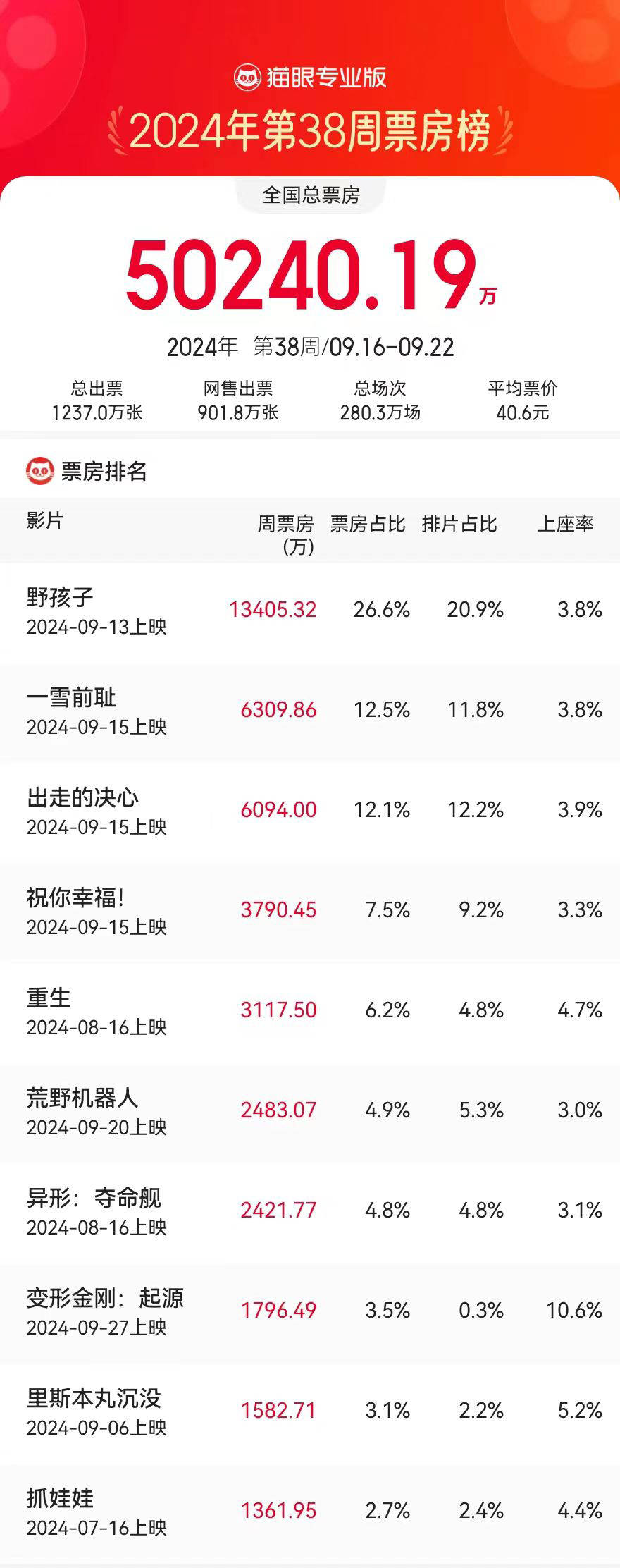 搜狐娱乐讯 据猫眼专业版数据,9.16-9.22内地一周票房报收5.02亿,因包含中秋档,票房较前一周2.8亿大涨79.28%。