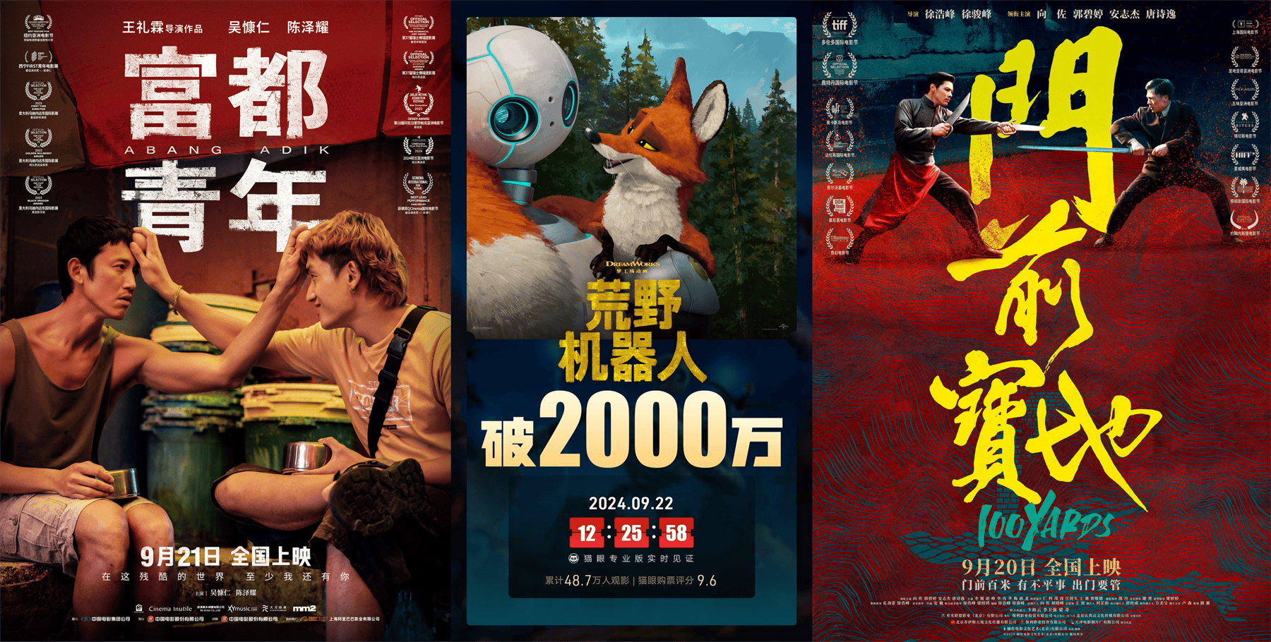 新片吴慷仁领衔主演马来西亚电影《富都青年》;徐浩峰、徐骏峰执导,向佐、郭碧婷领衔主演民国武侠电影《门前宝地》首周分别仅收199.03万、123.21万位列十九、二十二。
