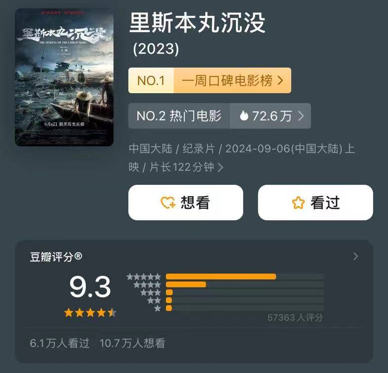 《里斯本丸沉没》豆瓣9.3分,今年国产片最高分。上映半月,其总票房为2569万,在纪录片票房榜上排名十四。