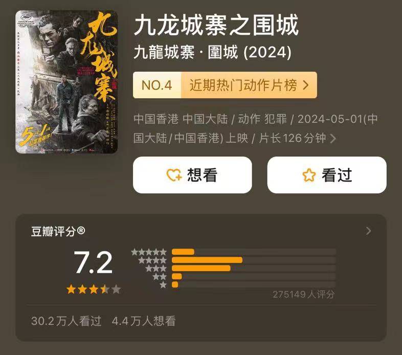 上半年的五一档,也曾发生过类似情况——同为类型片,豆瓣7分 的《九龙城寨之围城》没能卖过5分 的《末路狂花钱》。