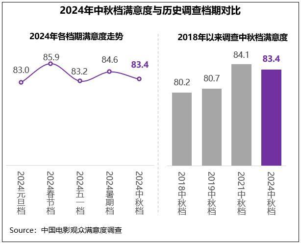 中国电影观众满意度调查・2024年中秋档调查结果显示,中秋档电影观众满意度得分83.4分,居2018年以来单独进行过调查的四个中秋档的第二位,在2024年截止目前调查的五个档期中居第三位,比2024年元旦档、“五一”档分别高0.4分、0.2分。