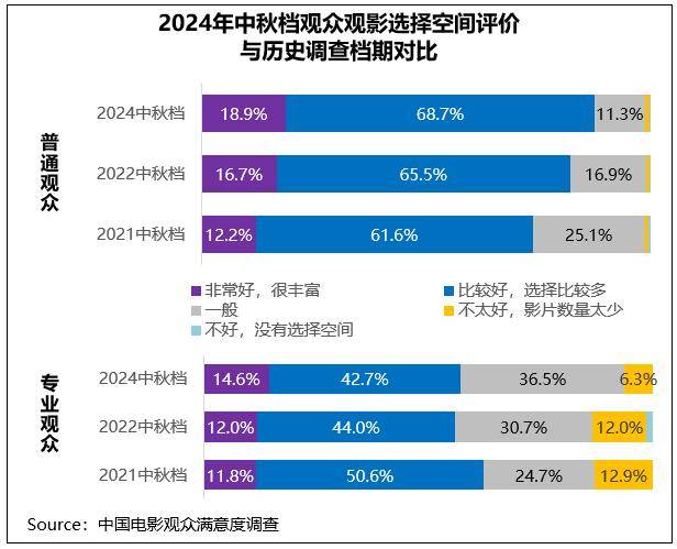 满意度调查数据显示,普通观众认为档期观影选择空间“非常好”和“比较好”的占比合计达87.6%,相比2021、2022年同期呈现稳步增长;专业观众这一占比合计57.3%,比2022年同期增长1.3个百分点,同时专业观众认为档期观影选择空间“非常好”的占比从2021年的11.8%稳步增长至2024年的14.6%。