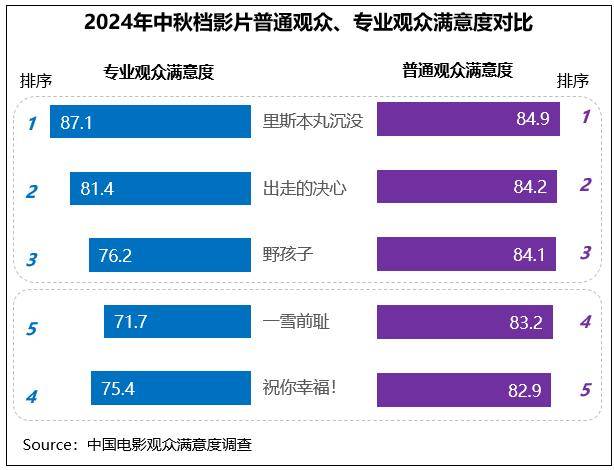 从整体评价上看,普通观众和专业观众满意度前三排序保持一致。兼具历史价值与人文关怀的《里斯本丸沉没》得到了不同类别观众的一致认可,普通观众、专业观众满意度都为档期第一名;其中专业观众满意度尤为亮眼,得分87.1分,高于2024年春节档的《第二十条》和2023年春节档的《满江红》,居2022-2024年调查156部影片的第一位。
