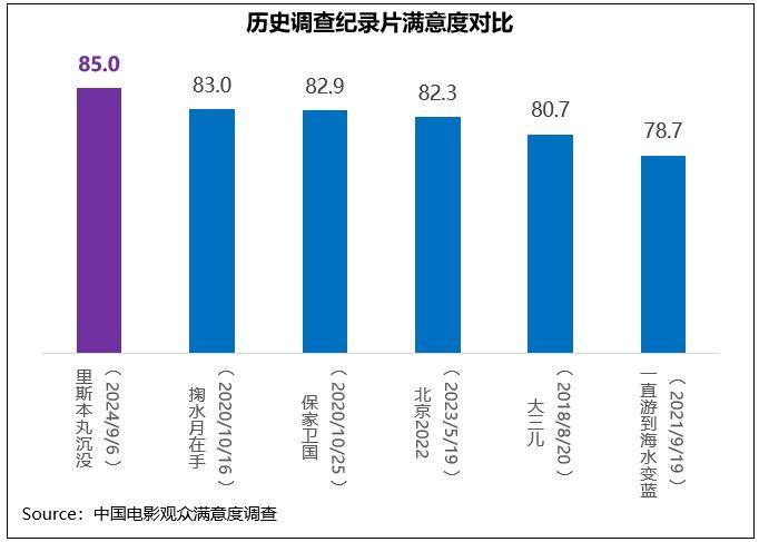 《里斯本丸沉没》为方励导演的纪录片,影片回望战争历史,凸显出深刻的人文关怀,获得观众高满意度评价,满意度得分85.0分,居中秋档首位,为2024年春节档以后调查影片的第二名(仅次于暑期档《抓娃娃》85.8分)。《里斯本丸沉没》在遵循纪录片真实性第一要义的基础上,较好地呈现出叙事节奏与张力,满意度在历史调查的一众纪录片中居第一位。