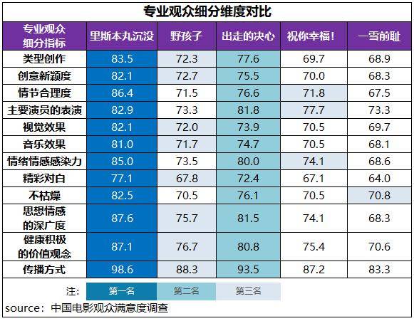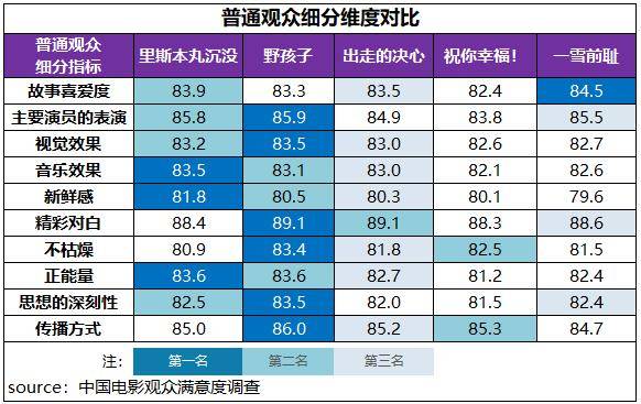 《出走的决心》和《野孩子》都居普通观众、专业观众评价的第二、第三位,其中二者普通观众满意度都超过了84分且分差仅0.1分;《出走的决心》专业观众满意度更胜一筹,得分81.4分,比居第三位的《野孩子》高5.2分。