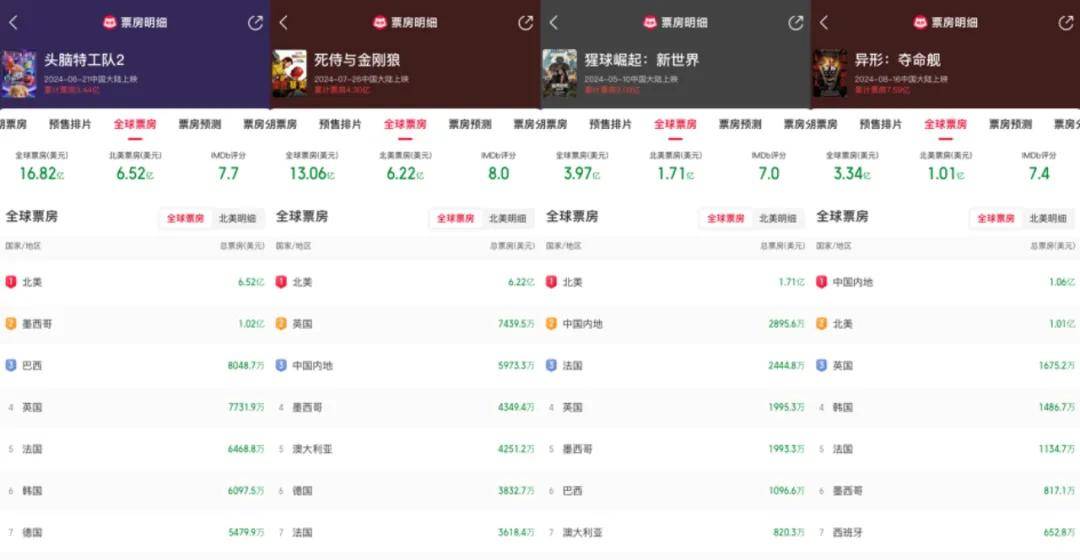 在这个过程中,迪士尼无疑扮演了“救市主”的角色。从单片来看,《头脑特工队2》和《死侍与金刚狼》双双突破6亿大关,并分别改写动画长片和R级电影的历史纪录,两片合力贡献整个暑期档超过1/3的份额,成为驱动影市行情转热的火车头。以皮克斯和漫威影业为代表,迪士尼包揽年度卖座榜前两席,助推制片业务迎来快速反弹,逐渐摆脱去年多片亏损的阴霾。与此同时,归于迪士尼旗下的20世纪影业也表现亮眼,《猩球崛起:新世界》和《异形:夺命舰》都排进档期前12名,实力不逊于好莱坞五大的其余玩家。以整体视之,迪士尼的发行总票房报收于15亿美元,市场份额更达到42%左右。