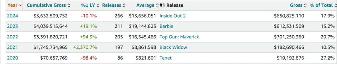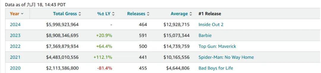不似国内暑期档高开低走,北美恰好反过来——开局不佳,但后半程奋起直追。档期总票房以逾36亿美元收官,同比跌幅一成左右。