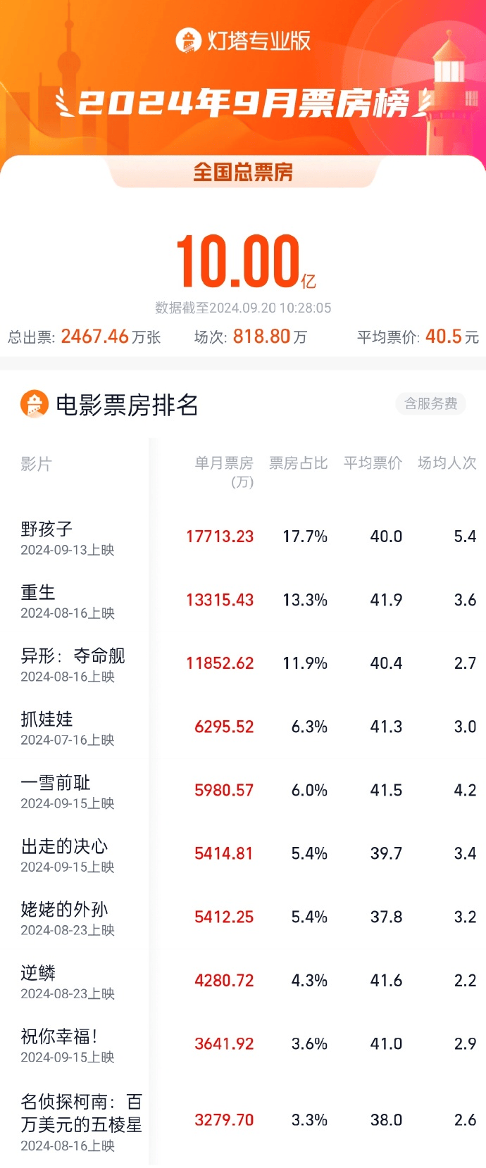 2024年9月票房破10亿 《野孩子》《重生》《异形:夺命舰》暂列前三