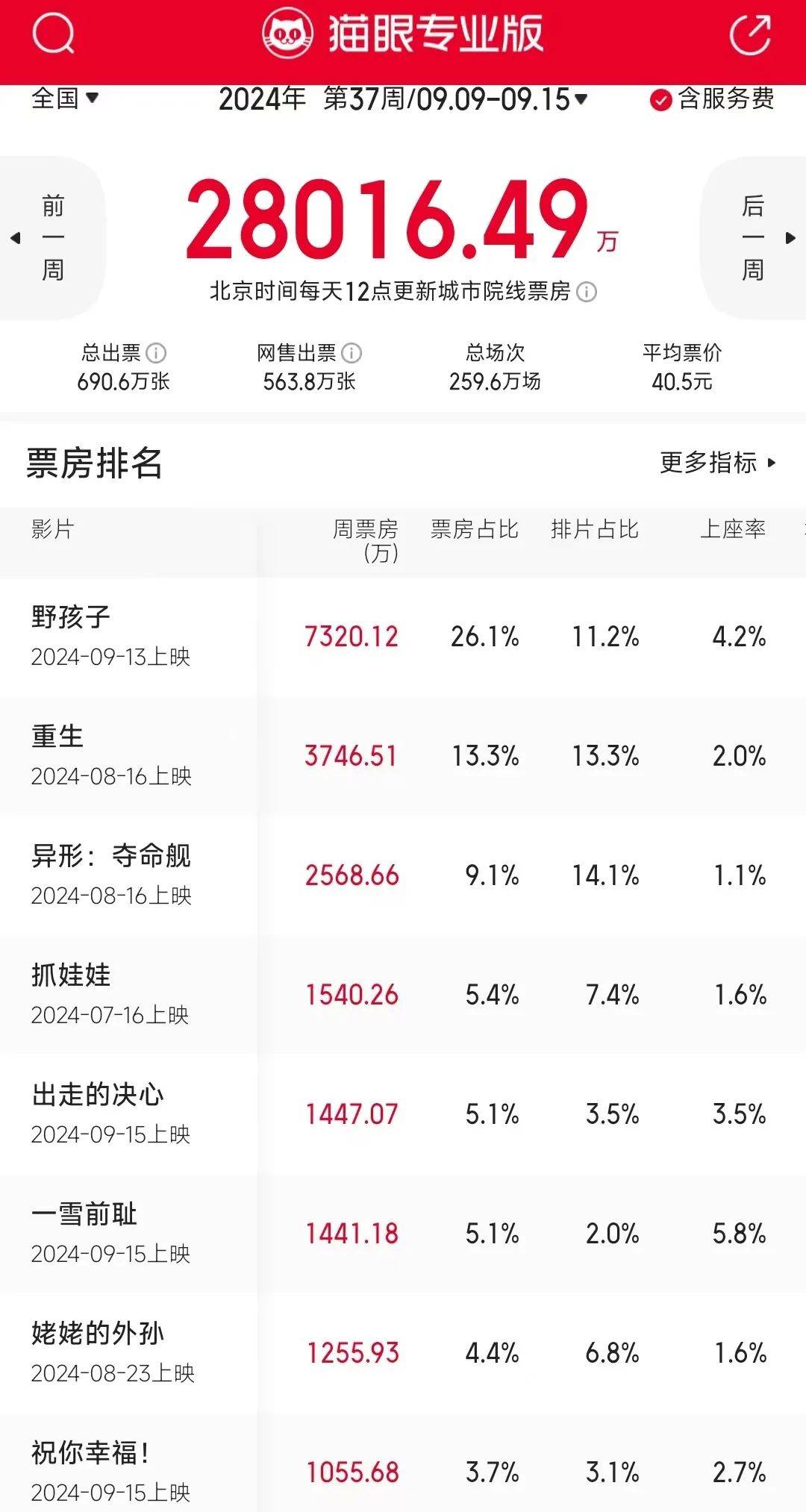 几部中秋节新片的总体竞争力并不算强。其中,由殷若昕执导,王俊凯主演,改编自“流浪兄弟”热门新闻报道的电影《野孩子》市场表现最为出色,首周(三天公映加一天点映)报收7320万夺得周榜冠军,目前累计票房近1.7亿。