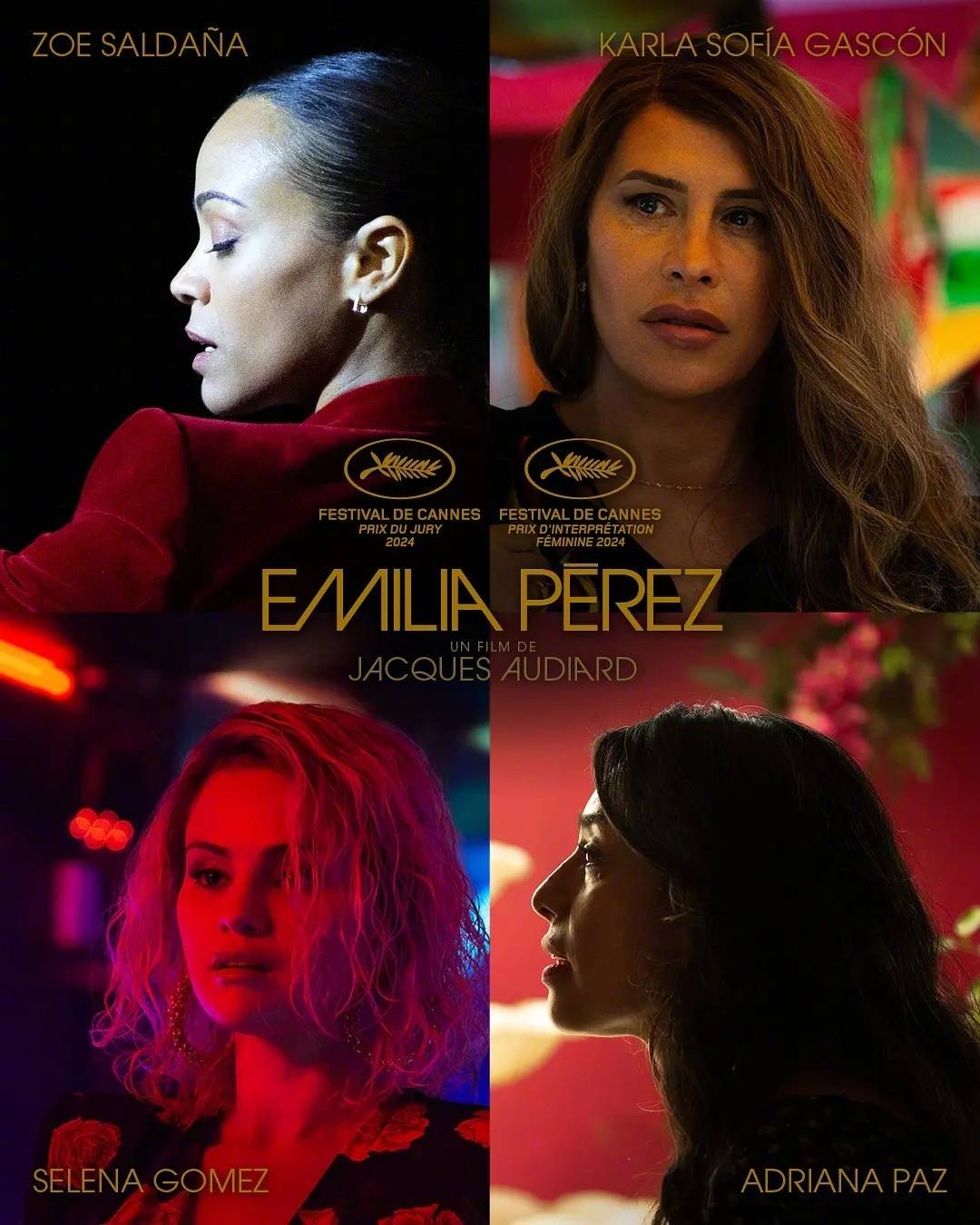 该片斩获2024第77届戛纳电影节评审团奖,四位女主佐伊·索尔达娜、卡拉·索菲娅·加斯科恩、阿德里安娜·帕兹、赛琳娜·戈麦斯同获主竞赛单元最佳女演员奖。