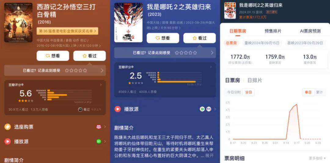另外两部则让人有些丈二和尚摸不着头脑。一部是2016年春节档上映的《西游记之三打白骨精》,豆瓣评分5.6。不少其它媒体将这一重映动作评价为“蹭《黑神话:悟空》热度”。