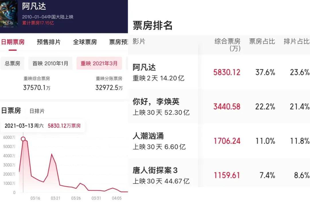 排片也不再受限,如2021年重映的《阿凡达》,重映第二天就以23.6%的排片占比超过同期霸占榜首的《你好,李焕英》成功登顶,最后拿下3.75亿票房成绩,甚至高出许多同期上映的新电影。