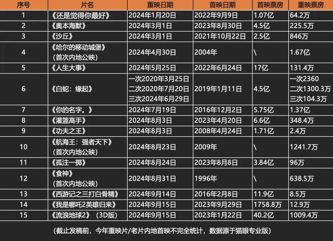 但重映片不能走向“凑数品”。由于去年中国电影市场存量几乎消耗殆尽,今年电影库存更加捉襟见肘,重映片相较上一年肉眼可见地多了起来,但效果也不尽如意。除了《你的名字》,《奥本海默》《沙丘》等重映片都没有破千万,《孤注一掷》连百万都不到,《功夫之王》只有2.3万,而这些作品在首映时都是过亿之作。