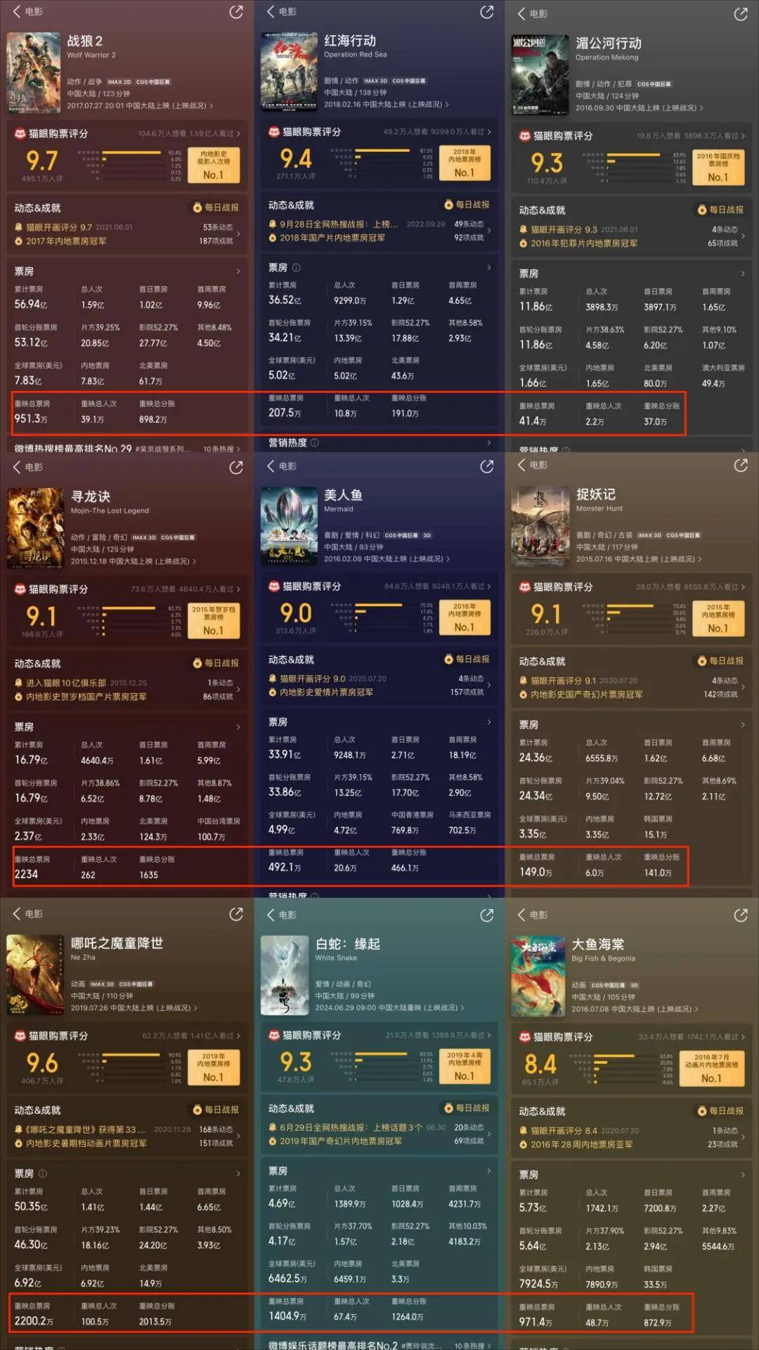 这些类型多元的重映片,以高票房、高情绪、高口碑作品为主,大多通过公益发行的方式上映,所有的放映收入都划归影院。从票房表现上,不难看出动画电影还是有不错的二次吸引力,其次是更能连接观众情感、唤起家国情绪的作品,而那些动作、奇幻商业类型片更像一次性买卖,似乎很难产生重复的商业价值。