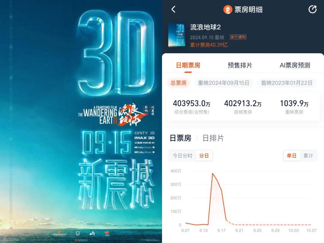 大家相对熟知的应该是《流浪地球2》的3D重制版,在中秋档共拿下了968.35万票房,排名档期第九。2D转制3D也是过去常见的重映逻辑,起码重映体验与首次上映之间形成了些许区隔。