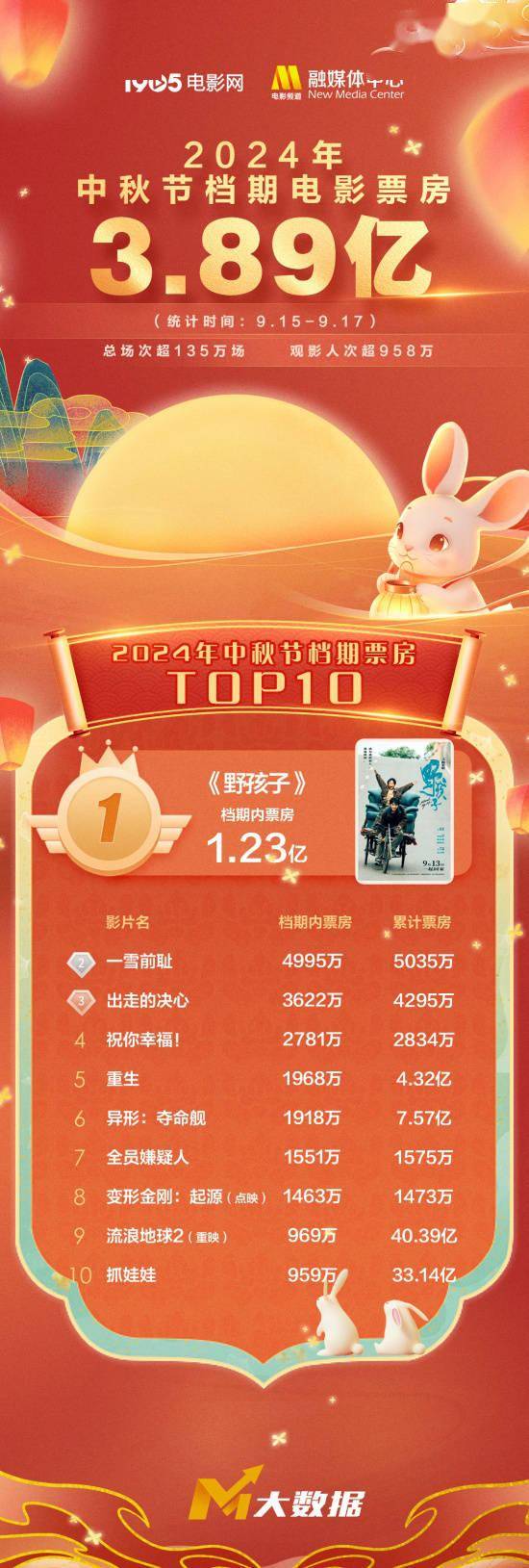1905电影网讯2024年中秋节档期(9.15-9.17)全国电影票房收3.89亿元,观影人次超958万,总场次超135万场。 档期票房1.23亿位列榜首,累计票房1.56亿,为2024中秋档票房冠军。位居亚军,累计票房突破5千万。分列档期票房第三位至第五位。