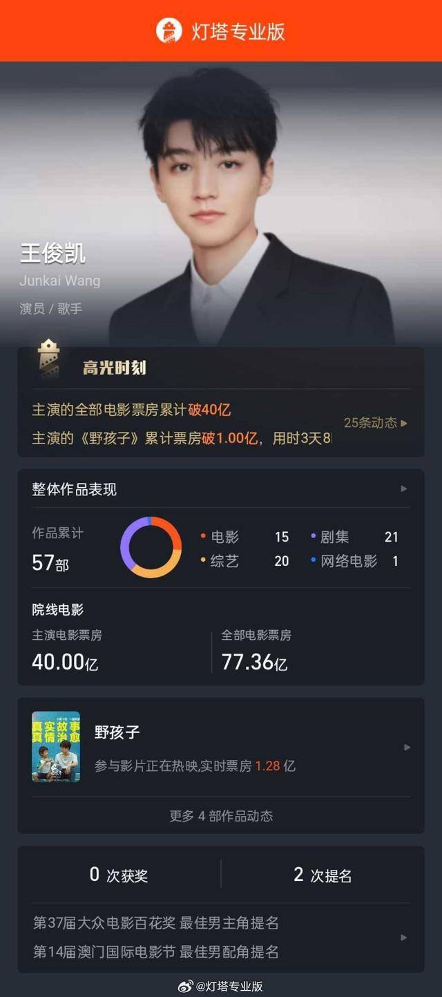 9月17日,据灯塔专业版显示,影片《野孩子》《刺猬》正在热映中,票房分别达到了1.28亿和1.44亿,助力演员王俊凯主演电影票房突破40亿。王俊凯主演其他电影作品包括:《万里归途》票房15.93亿,《断·桥》票房2.32亿,《1921》票房5.04亿,《解忧杂货店》票房2.23亿。