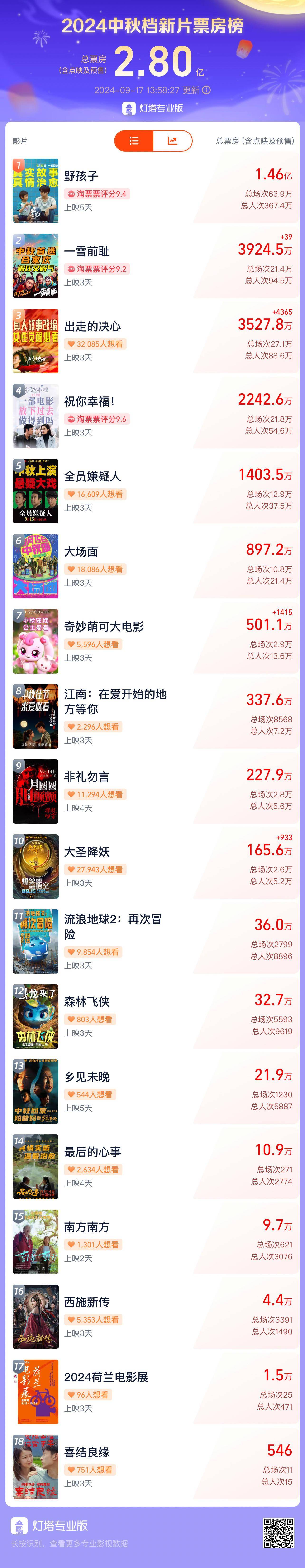 除此之外,分列排行榜第四至六位。此外,中秋档唯一一部好莱坞电影在榜单内也占有一席之地,以破227万的票房成绩排在第九位。