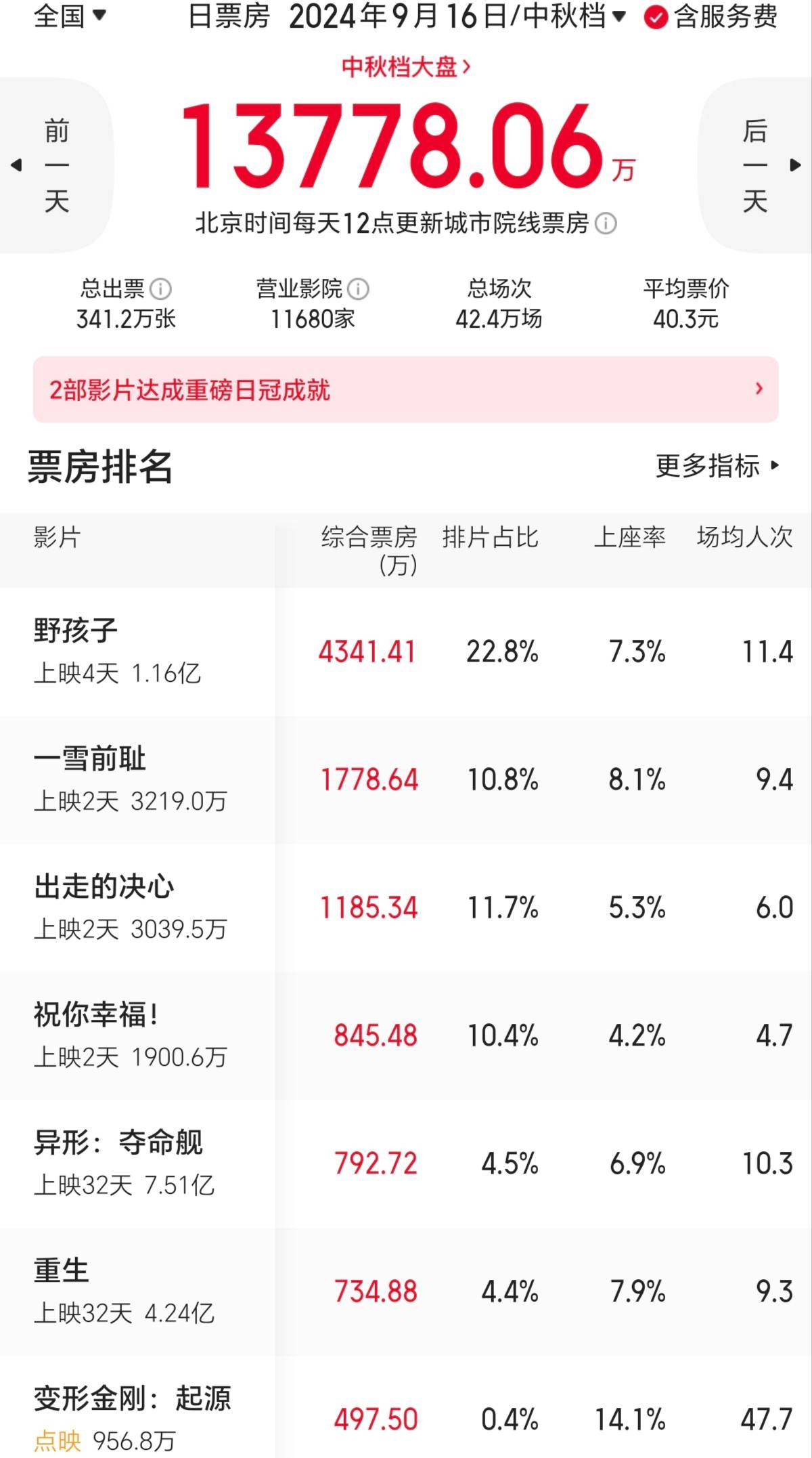 王俊凯主演的《野孩子》排片、日票房仍遥遥领先,上座率表现也在第一梯队,上映第四天票房4341万元,累计票房超过了1亿元,猫眼专业版预测其最终总票房可能过3亿元。