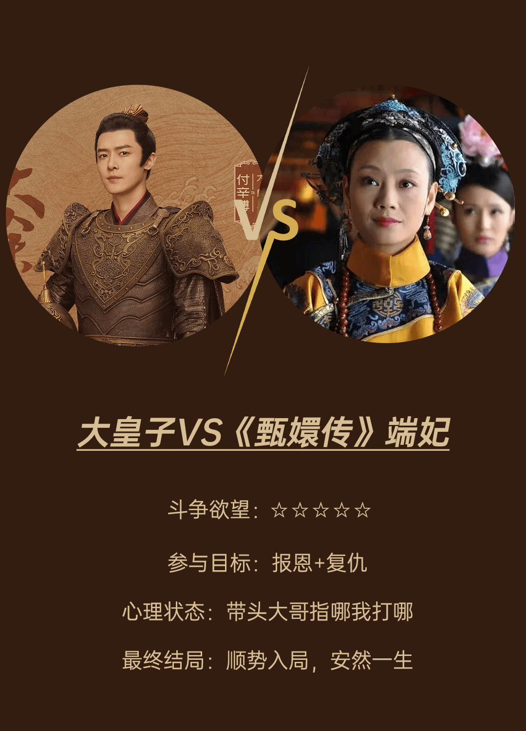 这场宫斗中,他完全可以和无子无宠的端妃一样坐山观虎斗,然后出于个人原因和时势所迫,他还是入局了。这个原因是上一代的恩怨:叶轻眉曾保全了宁才人和未出生大皇子的性命,是母子俩的恩人;陈萍萍在逃亡路上与宁才人暗生情愫,是宁才人的爱人;庆帝明知这一切但依然默许了对叶轻眉的谋害,残忍的拆散了陈宁恋,是宁才人的仇人。这一切爱恨情仇其实都被大皇子不声不响的继承了,他遵从母亲的嘱托,无论局势如何衍变,保全恩人之子范闲是最高优先级。所以在宫斗中他从不选边站,超然于外,但每每看似公允的行动实则都在暗中帮了范闲的大忙,就如同端妃那样,运用自己与皇帝的情谊,多次巧妙的替甄嬛解围,两人都是以心照不宣的方式,与自己有实无名的盟友扶持前行。