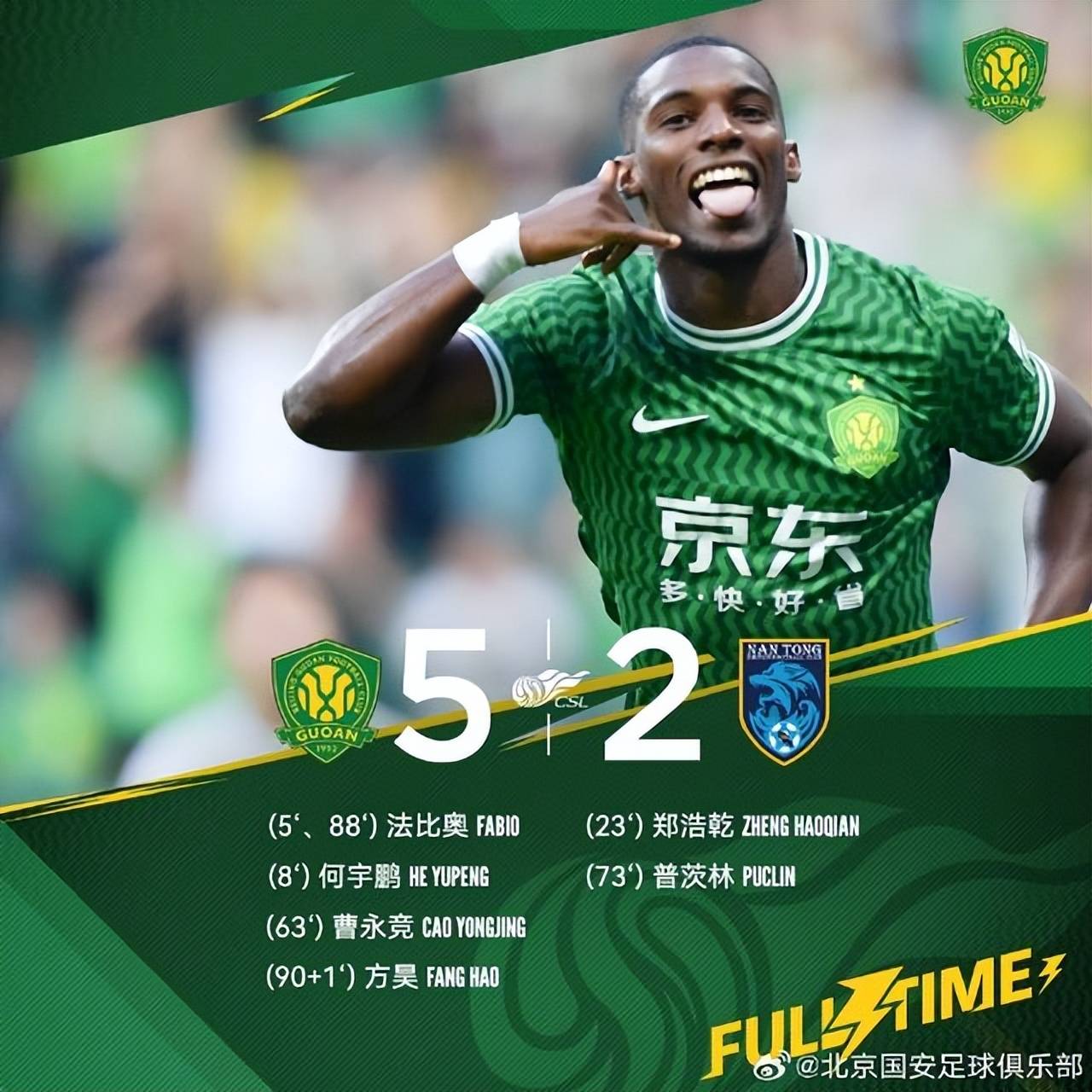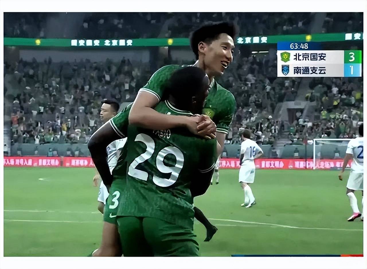 随后,乃比江换下张稀哲,国安变阵541,稳守反击。接着,法比奥和方昊再入两球,彻底锁定胜局。