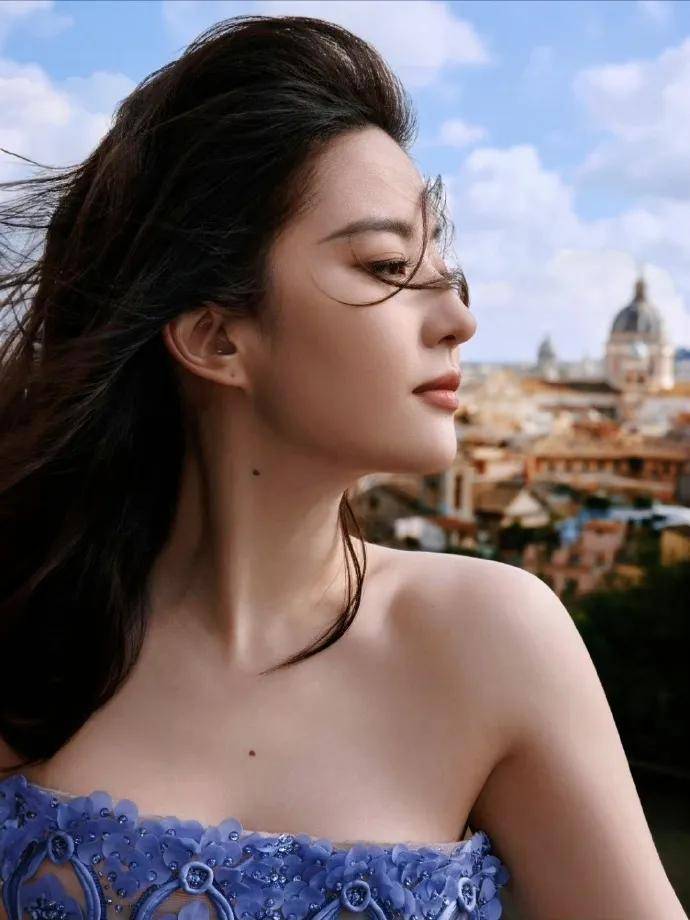 刘亦菲身穿一袭蓝色花瓣抹胸裙,侧身若有所思的样子很妩媚,她俏脸成熟靓丽,乌黑的长发飘逸,露出白皙的香肩,这样的美女真是风情万种!