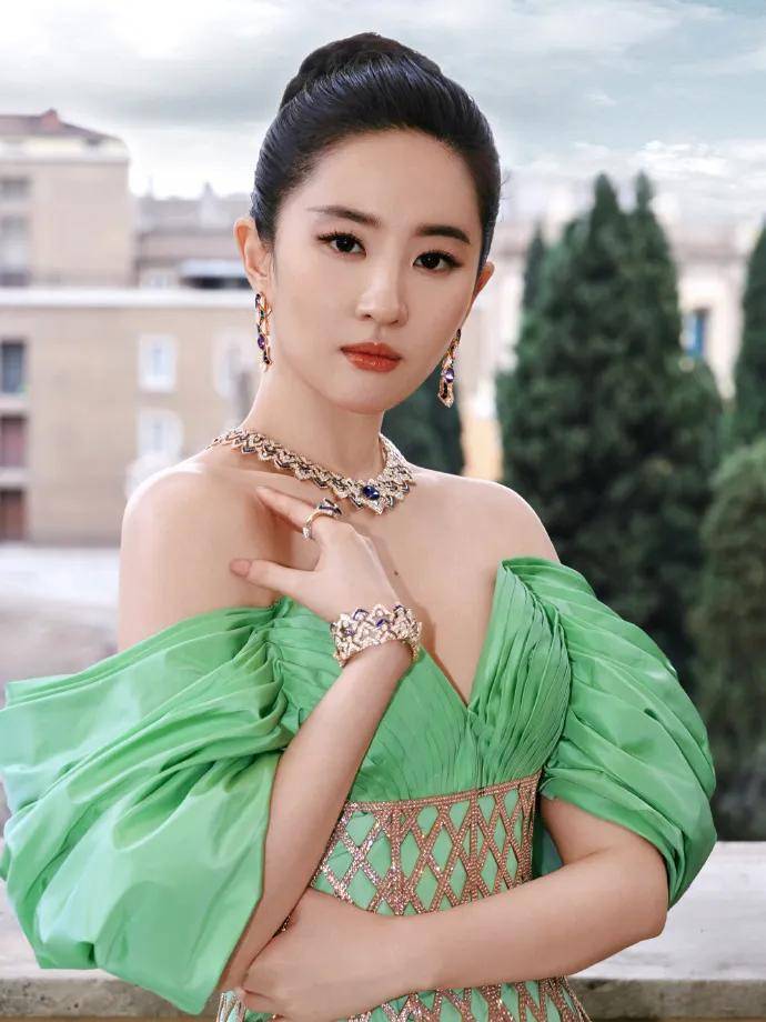 其中一套写真,刘亦菲身穿绿色深V长裙,脖子和耳朵上都戴着名贵珠宝首饰,她俏脸清丽脱俗,浓眉大眼,烈焰红唇,长发盘起,双手撩起的样子很可人,微微露出自己的事业线,还是很性感撩人!