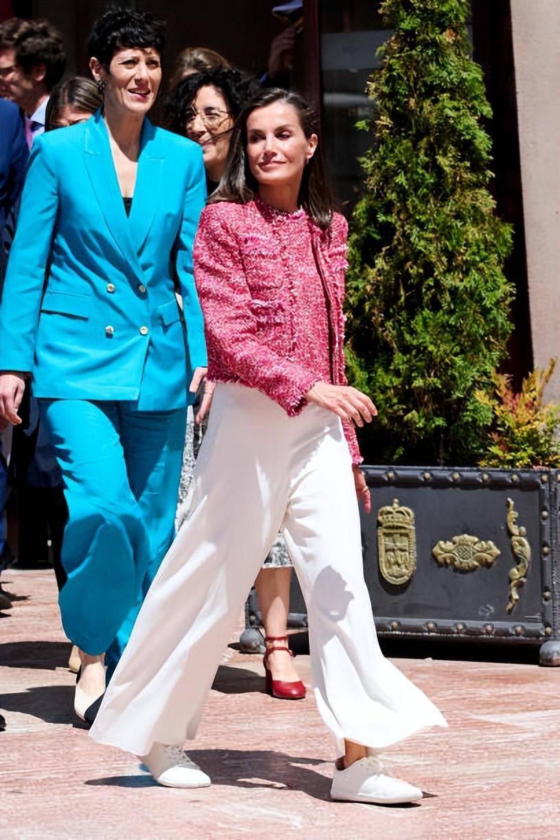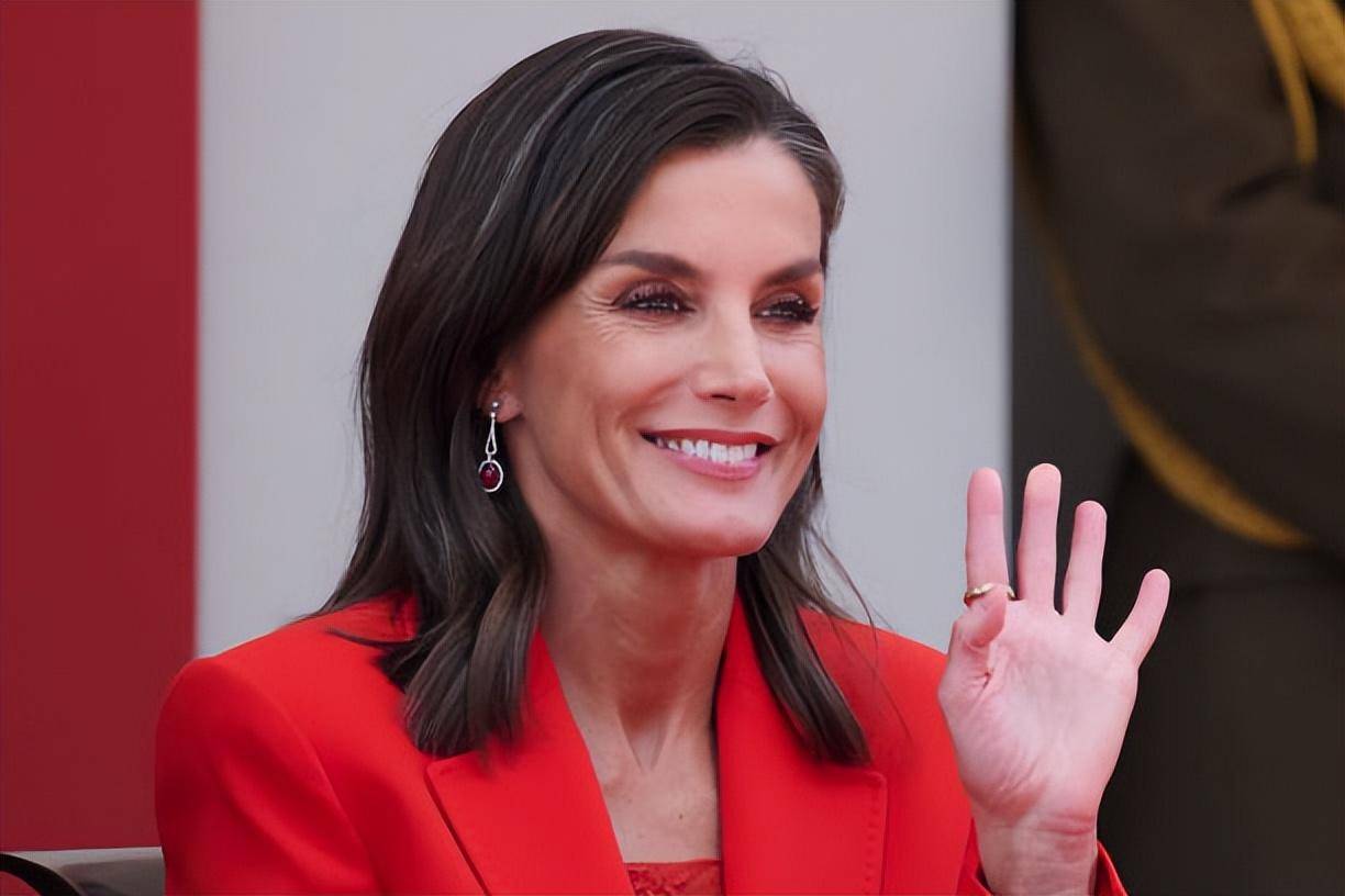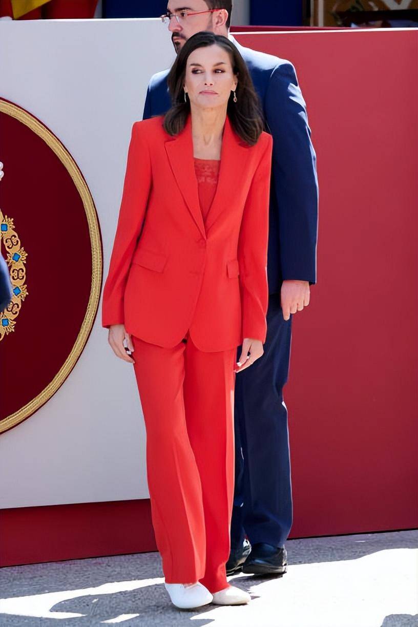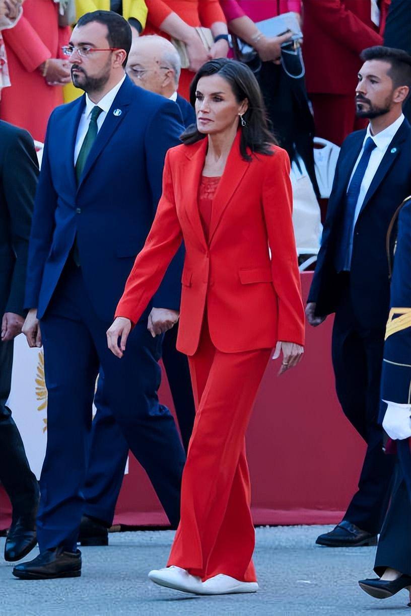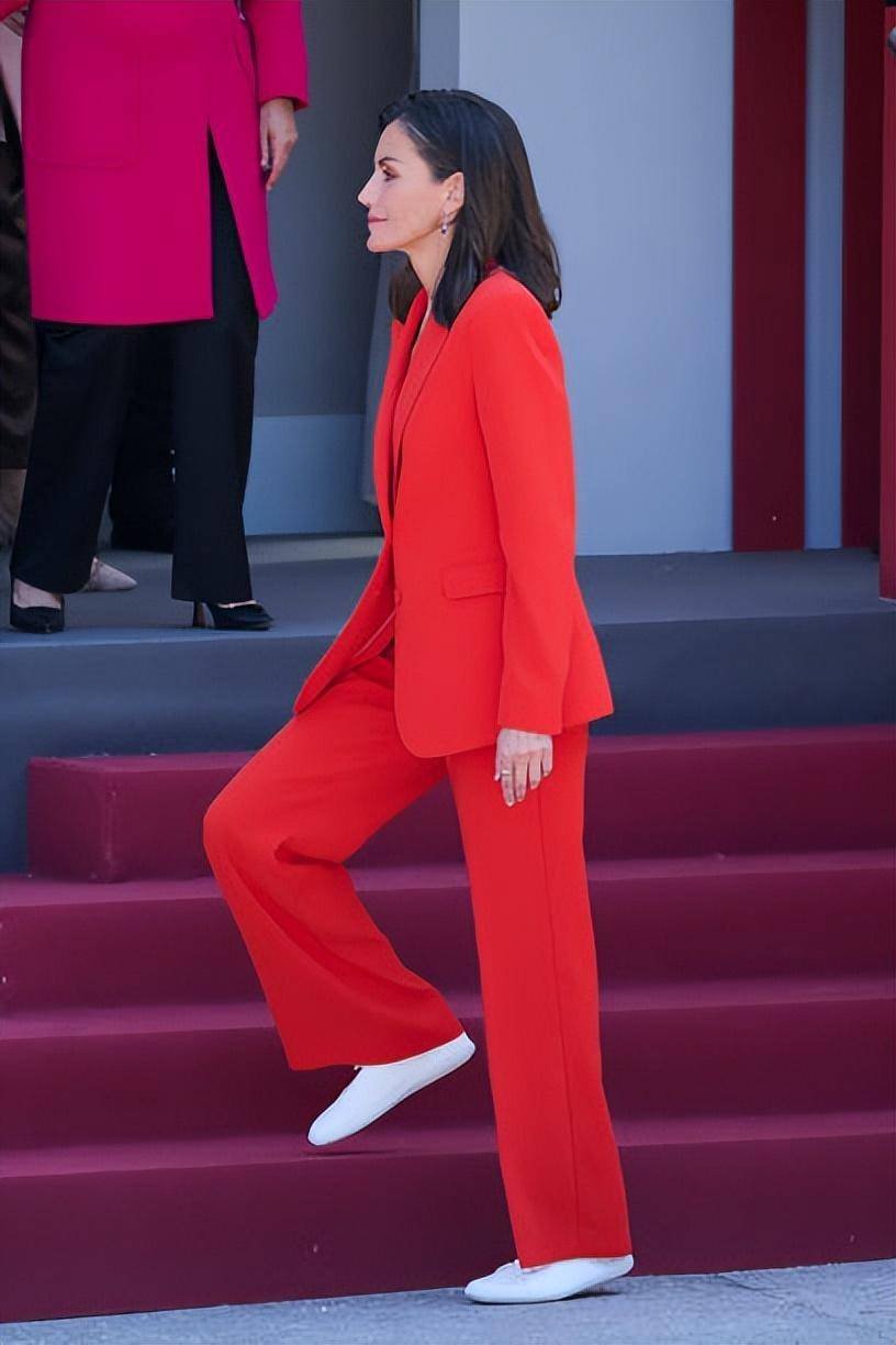西班牙王后做回自己!出席活动穿平底运动鞋,一身红色西装好惊艳