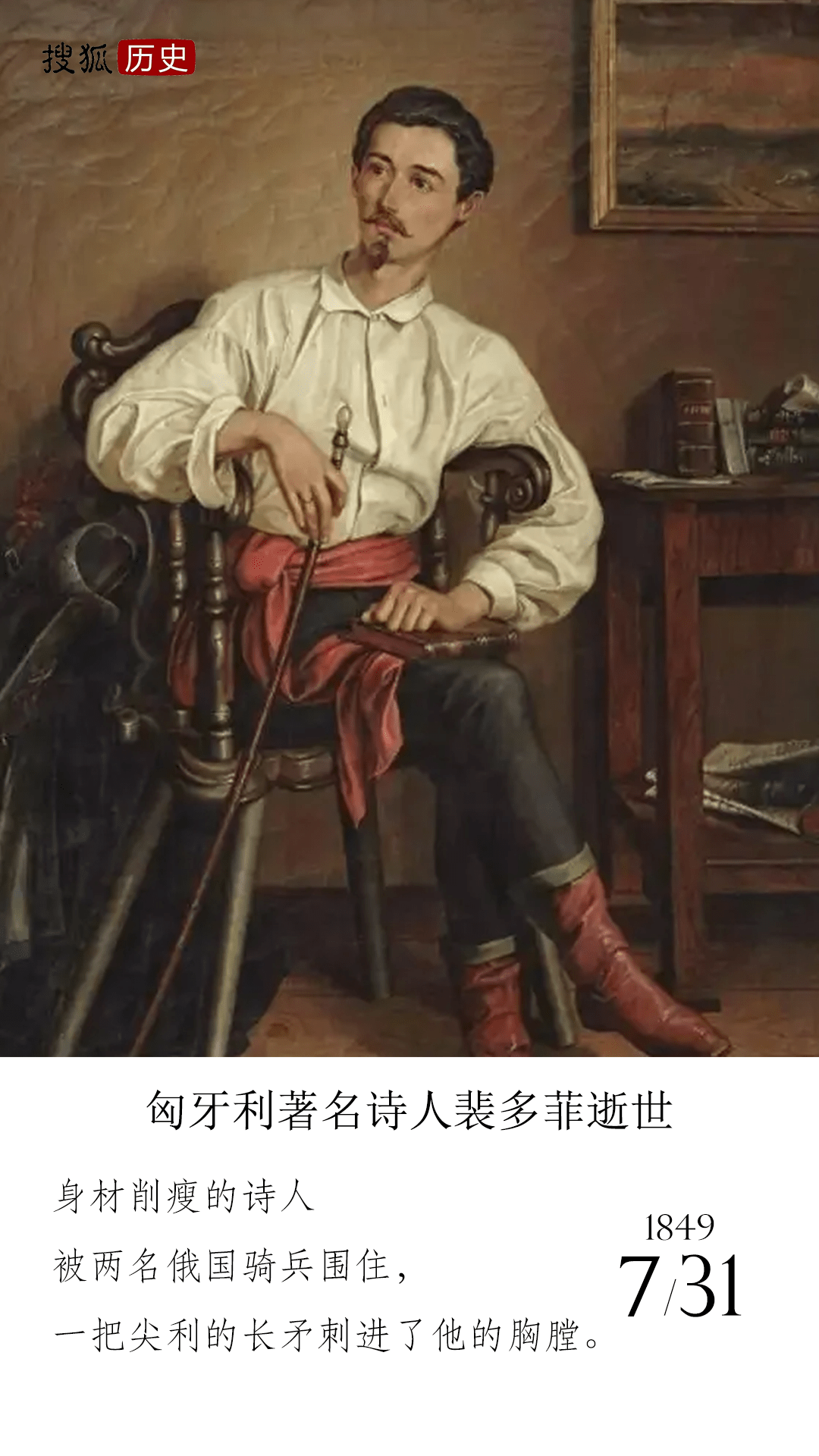 1849年7月31日,匈牙利爱国诗人裴多菲作战时牺牲,年仅26岁。