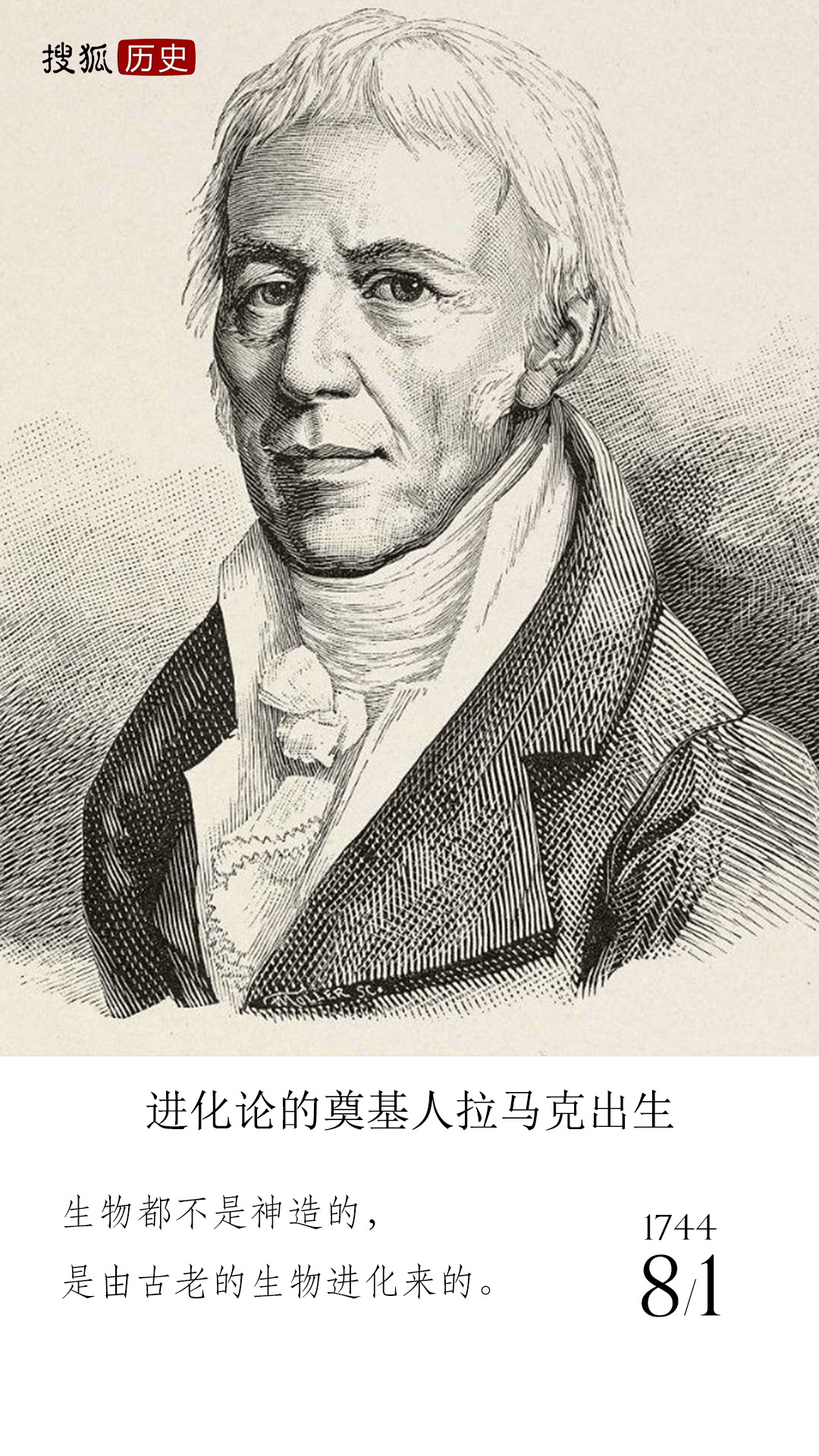 1744年8月1日,法国伟大的博物学家,较早时期的生物进化学者之一。1809年发表了《动物哲学》一书,系统地阐述了他的进化理论,即通常所称的“拉马克学说”。书中提出了“用进废退与获得性遗传”两个法则,并认为这既是生物产生变异的原因,又是适应环境的过程。达尔文在《物种起源》一书中曾多次引用拉马克的著作,为达尔文的进化论奠定了基础。