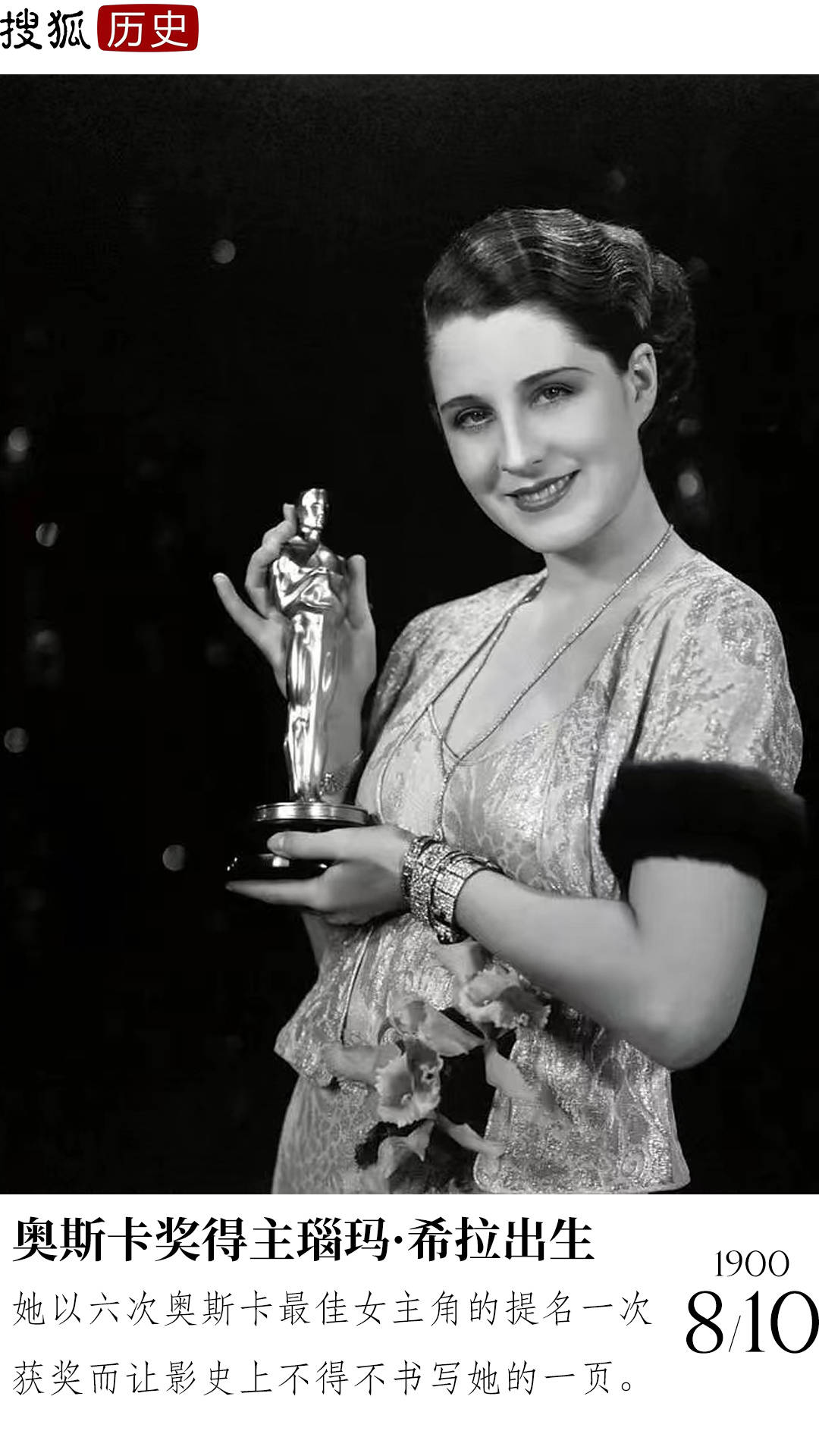 1900年8月10日,“好莱坞第一夫人” 瑙玛·希拉出生。希拉一生共六次被提名奥斯卡奖,并在1930年凭借电影《弃妇怨》中的出色表现获得第三届奥斯卡最佳女主角奖 。代表作主要有《离婚者》、《他们的欲望》。